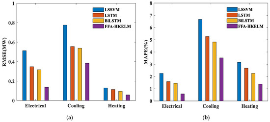 Here, the FFA-HKELM model proposed in this paper is compared with the results of three traditional models, and the error indicator histograms of the results of electric, heating and cooling loads are shown in Figure 9. It can be observed that this model has the best predictive effect for electric heating and cooling loads, and obtains the smallest RMSE and MAPE value.