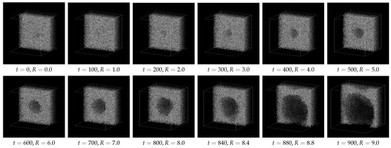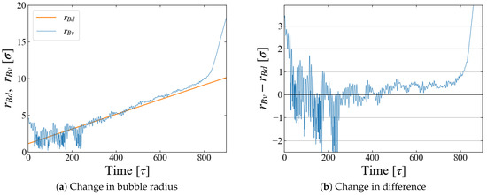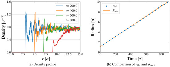 - For the main simulation, the radius of the force field is increased and the resulting “bubble” growth is monitored.where is a time-dependent variable corresponding to the bubble radius, where the bubble is the region of excluding LJ particles. In this paper, we simply adopted with a size linearly increasing with time,where is a positive constant. dependence is briefly discussed in Section 5.4.