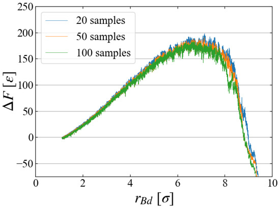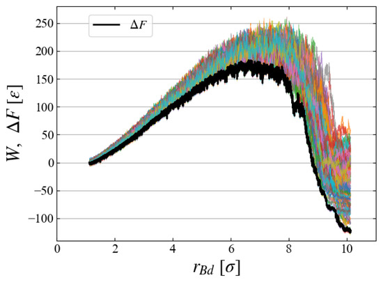 - We perform simulations multiple times, calculating for each case. The free energy change from the initial state is evaluated by taking the ensemble average as the Jarzynski equality, Equation (6), as a function of t.