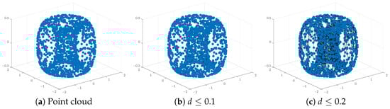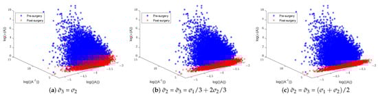 Figure 4 shows a significant change in the distribution of the norms of the inverses of 3 × 3 matrices post-surgery, which is consequently reflected in their condition number distribution. The use of a linear combination formula helps keep the range of condition numbers below a certain threshold depending on the range of singular values. For instance, 3D illustrations in Figure 5 show a significant reduction in the condition number by keeping the ranges below 3 in (b) and 2 in (c), where and are replaced with and , respectively. The new minimum and maximum condition number values for both sets after matrix surgery are and , respectively.