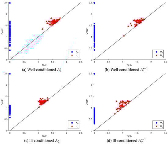 To illustrate the above process, we generated a set of random Gaussian filters of size 3 × 3 matrices sorted in ascending order of their condition number, and we created two point clouds: (1) of the 64 matrices with the lowest condition numbers and (2) with the 64 matrices of the highest condition numbers. is well-conditioned, with condition numbers in the range [1.19376, 1.67], while is highly ill-conditioned, with condition numbers in the range [621.3677, 10,256.2265]. Below, we display the PDs in both dimensions of , and their inverse point clouds in Figure 3.