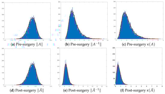 Distribution of matrices pre- and post-surgery: (a,d) original matrix norms, (b,e) inverse matrix norms, and (c,f) matrix condition numbers.