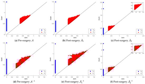 Again, we estimated the proximities of the PDs of the various related pairs of point cloud matrices and their inverses in term of the bottleneck and the Wasserstein distance functions. The results are shown in Table 5 below. The significantly large distances in dimension 0 explain the noted differences between the PD of and that of . In dimension 1, the surprisingly small bottleneck distance between the PD of and that of indicates that bottleneck distances may not reflect the dissimilarities in visual representations. The distances between the PDs of and in both dimensions are reasonably small, except that in dimension 1, the distance increased slightly post the surgery. This may be explained by the observation made earlier that “many holes have longer lifespans, while many others are born later than the time that all holes in vanish” when visually examining the 1-dimensional PDs. Finally, these distance computations confirm the strict similarity reported above between the PDs of and .