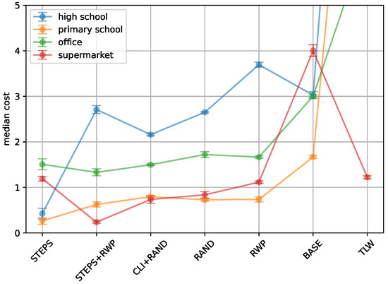 Figure 1 presents the costs associated with each method as derived from the objective optimization function. The STEPS and STEPS+RWP approaches consistently achieve the lowest costs across most types of locations, followed by CLI+RAND and RAND. Notably, for TLW, RWP, and BASE, performance varies significantly with location type. For instance, TLW achieves costs lower than 1.5 for the supermarket location but exceeds a cost of 10 at other locations. This variability highlights the location-dependent performance of models, a topic we will explore further in Section 5. Overall, the high school network presents the greatest challenge for the tested models, followed by the office network. Conversely, the primary school and supermarket networks yield the lowest costs across all tested models.
