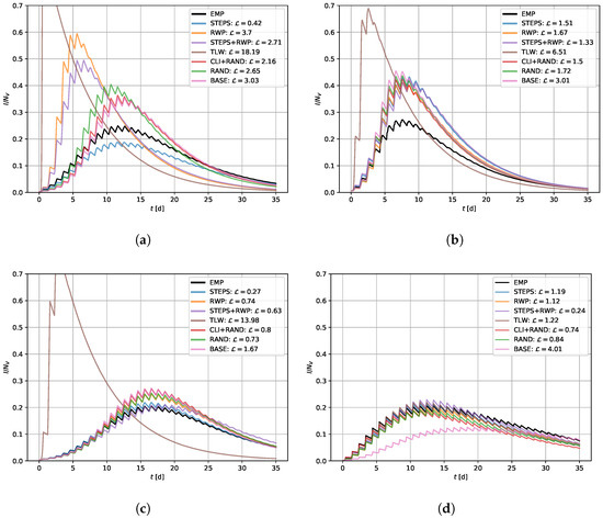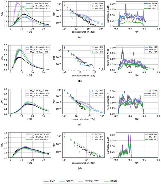 Comparison of STEPS and STEPS+RWP with the empirical network (EMP). The leftmost column shows the SIR curves, with the proportion of infected individuals () on the y-axis and time in days (t[d]) on the x-axis. The middle column displays the probability density function (PDF), with the contact duration on the x-axis. The rightmost column depicts the normalized edge counts (), with time in hours (t[h]) on the x-axis. All depicted edge counts are smoothed over 20 time steps. (a) High School; (b) Office; (c) Primary School; (d) Supermarket.