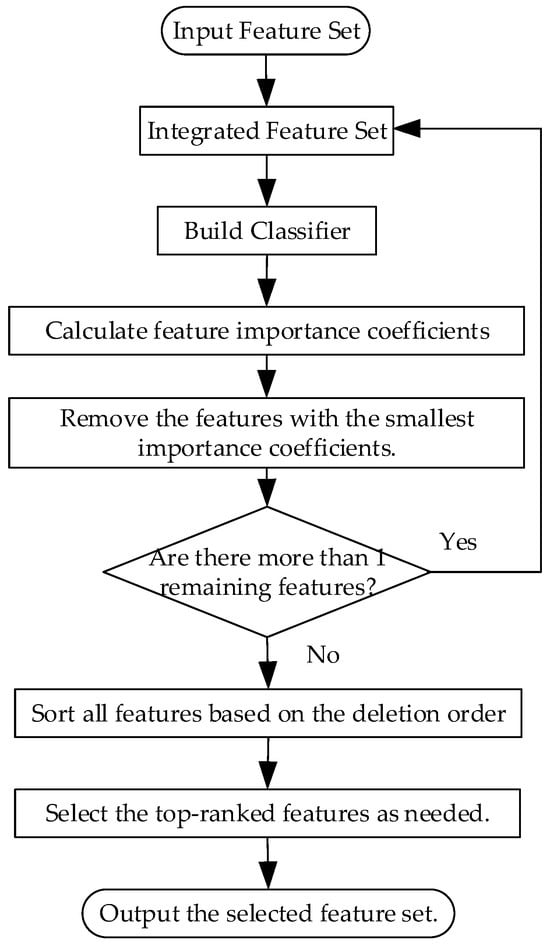 RFE [] is a bottom-up method that starts with all features and iteratively construct models while it eliminates the least important features to choose the most advantageous set of features. In each iteration, RFE trains a model and uses feature importance scores (such as coefficient magnitude, information gain, etc.) to determine which features should be removed. This procedure is iterated until the necessary quantity of characteristics is attained or until a predetermined termination condition is satisfied. RFE can be used with different evaluation methods and models, making it highly flexible and applicable. Moreover, RFE demonstrates good stability and reliability in feature selection. Figure 3 shows the flowchart of the recursive feature elimination algorithm.