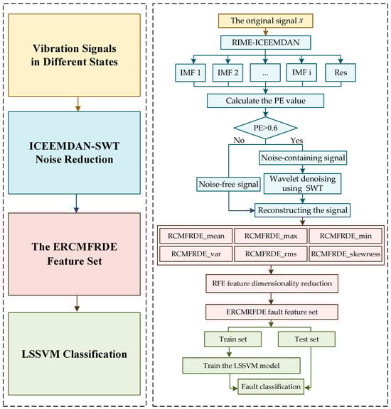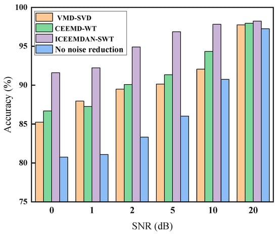 - In a noisy environment, the fault diagnosis method based on ICEEMDAN–SWT and ERCMFRDE continued to perform well, indicating that the method is effective in eliminating interference components unrelated to fault characteristics. This indicates that the method displays both excellent generalization capabilities and robust performance.