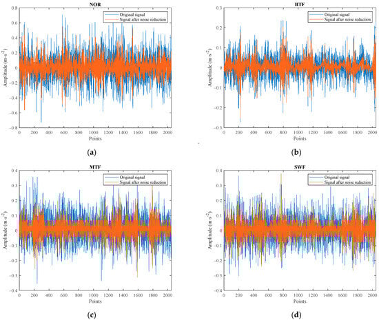The conventional approach to noise cancellation entails the utilization of filters for the reduction of signal noise by applying the spectral distribution law of signal and noise []. The Fourier transform is initially employed to transform the signal containing noise into the frequency domain []. Subsequently, a low-pass filter is utilized for the purpose of denoising. Wavelet transform (WT) exhibits excellent time–frequency localization characteristics, which have been extensively investigated in the context of signal denoising, resulting in highly promising outcomes []. It has emerged as a pivotal approach in signal denoising. It has been proposed that an SWT should be employed for the purpose of noise reduction in order to efficiently identify the defect features present in the vibration signal []. The advantages of the SWT over the ordinary WT include the following: SWT provides a more stable frequency domain representation, it facilitates the examination of nonstationary signals, and it is more sensitive to the capture of local details in the signal []. Furthermore, the SWT is more appropriate for the study of characteristics such as long-term trends and abrupt changes and, therefore, has a wider application in signal processing and analysis.