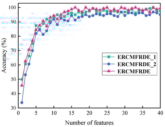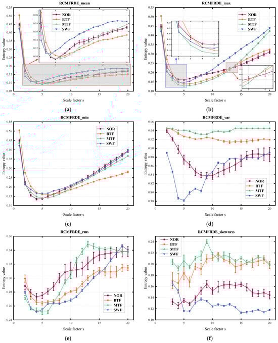 However, the aforementioned methods exclusively contemplate signals at a singular scale, which may overlook key time-related data. Costa et al. [] introduced the concept of multiscale entropy in order to address this constraint. This algorithm effectively addresses the singularity problem of traditional entropy algorithms in expressing timeseries features by applying multiscale coarse-graining processing to the temporal sequence. In recent years, gearbox failure diagnosis technology utilizing multiscale entropy algorithms has seen an increased application. Zheng et al. [] utilized multiscale fuzzy entropy to extract signal features for fault diagnosis input into support vector machines. Shao et al. [] improved the entropy bias phenomenon in traditional multiscale entropy algorithms using reverse dispersion entropy, addressing the shortcomings of coarse-graining processing through time-shifted sequences. However, the length of the temporal sequence after multiscale processing is shortened as the scale factor grows, leading to reduced stability of the entropy values. The majority of extant methodologies address this issue through the exclusive utilization of first-order moment processing, thereby failing to consider the potential value of other information present within the timeseries. Therefore, this paper proposes an improved feature extraction method based on ERCMFRDE, extending the ensemble coarse-graining processing method from multiorder moment coarse-grained processing. The attributes of the temporal data can be more comprehensively articulated through the parallel processing of features extracted from multiple perspectives.