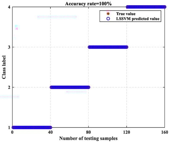 It is necessary to classify and identify fault characteristics after extracting them from the vibration signals of the gearbox. The application of neural networks [] and support vector machines (SVM) [] to small sample datasets is susceptible to overlearning and to a lack of robust generalization capabilities. The LSSVM [] is a specific form of SVM that operates under a quadratic loss function. This approach not only simplifies the computational process, but also effectively avoids the characteristics of local minima []. Li et al. [] presented a whole life cycle failure diagnostic technique for high-speed rolling bearings based on enhanced grey wolf optimization for LSSVM. Lu et al. [] employed a sparse empirical wavelet transform in conjunction with an adaptive dynamic LSSVM for the purpose of failure diagnosis of gear pumps. The particle swarm optimization (PSO) algorithm has the potential to enhance the speed of optimization of LSSVM parameters and augment the overall computational capacity of the model []. This paper presents the construction of the PSO–LSSVM model for the purpose of gearbox fault diagnosis.