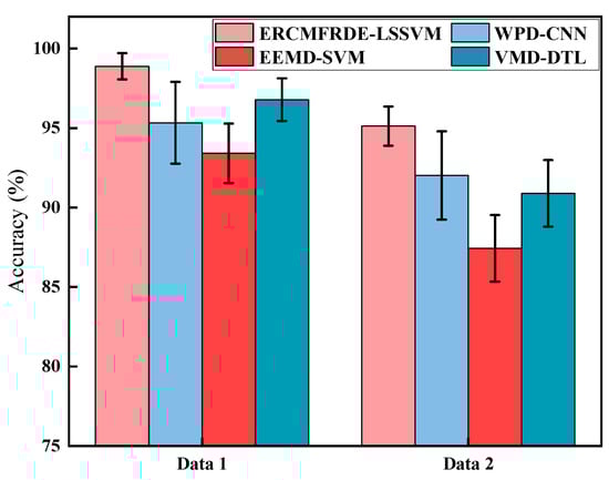 As illustrated in Figure 14, the ERCMFRDE–LSSVM method demonstrated a markedly superior success rate in diagnosing gearbox faults across two distinct datasets, outperforming the other three classic methods. This highlights its notable efficiency and superiority. Furthermore, the proposed method demonstrated a low error rate and minimal fluctuations in 20 diagnostic results, indicating its capacity to adapt to diverse vibration signal characteristics and failure modes with relative stability. This observation reflects the method’s stability and reliability.