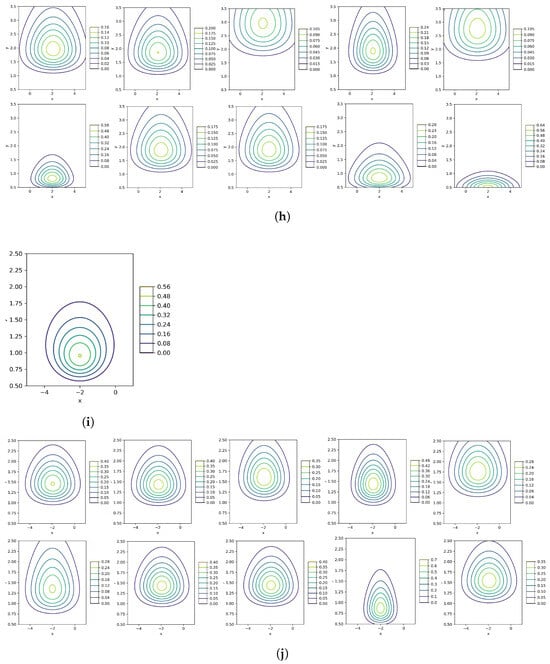 These plots are related to Table 1. The columns from left to right are related to the standard alternate optimization, parametric gradient-based with , gradient with natural parameters, and natural gradient, respectively. The rows of the estimated plots from top to bottom are based on MLE estimators and the initializations in the absence of information, respectively. The visualization inference is that in models and , the standard algorithm has the appropriate approximation, gradient-based method with acts acceptable in models and , and all methods have admissible estimations for . (a) The true model ; (b) The estimation plots of (a); (c) The true model ; (d) The estimation plots of (e); (e) The true model ; (f) The estimation plots of (c); (g) The true model ; (h) The estimation plots of (g); (i) The true model ; (j) The estimation plots of (i).