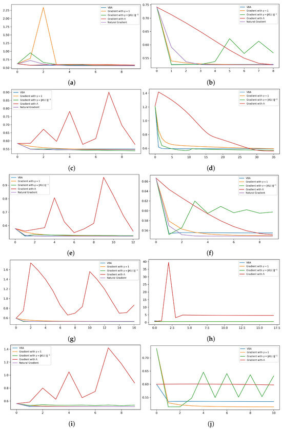 To gain an overview of the process, we plot its trend with respect to the number of iterations in Figure 3. The left column shows the results for the MLE initializations, where the minimization of occurs more quickly compared to the right column, which is associated with the evidence-free initializations. We do not plot the trend of the natural gradient’s in the second and last two models. The reason is that the becomes NaN in the initial iterations, so it is necessary to start the recursive process with some points estimated from the available data. The algorithms approximate the joint density function with a separable one but with different accuracy. In the following section, we tackle a more complex model.