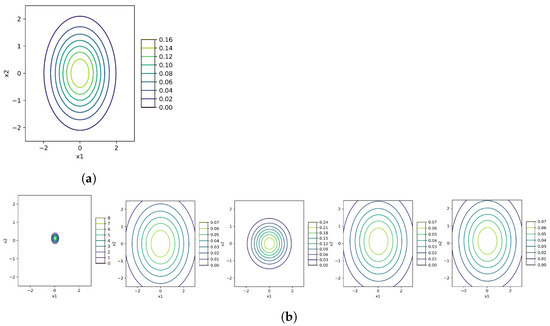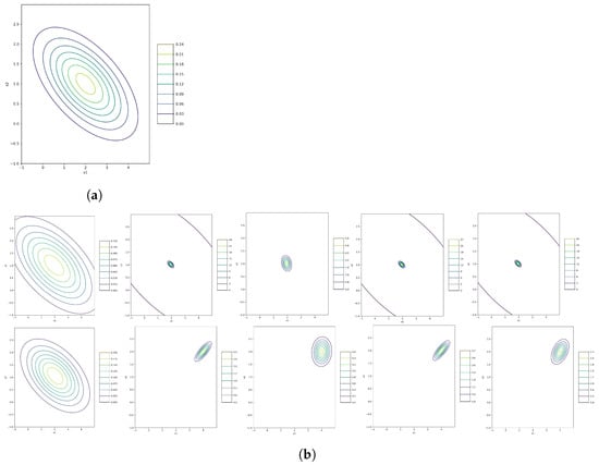 (a) True contour plot of model (5), almost separable; (b) These are the estimation of the model based on the standard alternative analytic approximation, gradient-based algorithm with and concerning the natural parameters, and natural gradient algorithm, respectively, from left to right.