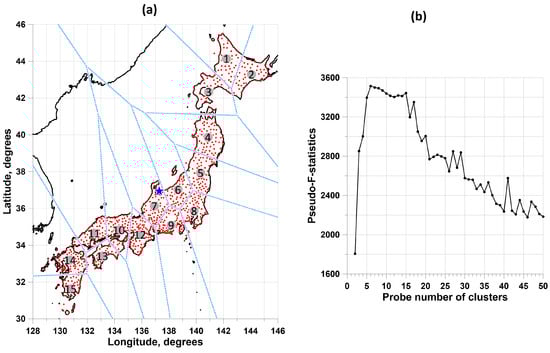 (a) shows the positions of 1047 GPS stations and their division into 15 clusters. The numbered circles indicate the centers of gravity of the clusters, and the blue lines indicate the boundaries between Voronoi cells. The blue star shows the position of the center of mass of all cluster centers. (b) shows a plot of the pseudo-F-statistic that allowed us to select 15 as the number of clusters.