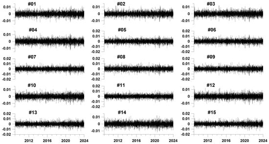 The set of 1047 GPS stations within domain , , were chosen. These stations presented in Figure 1a have daily time series from the beginning of 2009 to the end of 2023 (15 years), with a total number of gaps of less than 365 samples, and the longest gap less than 182 samples. The vertical components of ground displacement are investigated. The choice of only the vertical component for Japan is due to the fact that it does not contain the catastrophic jump and subsequent long-term relaxation due to the impact of the mega-earthquake of 11 March 2011. Gaps in the GPS time series are filled in using information from the left and right neighborhoods of the gap of the same length as the gap length [4].