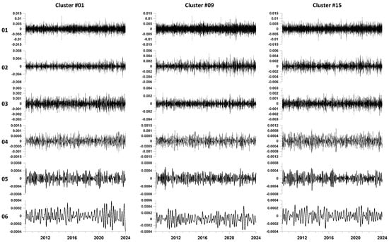 For each of the resulting 15 time series, EEMD waveforms of principal components were calculated. EEMD waveforms are obtained by averaging 1000 decompositions of the original signals, to which are added independent Gaussian white noises with a standard deviation of 0.1 from the standard deviation of the weighted average from each cluster. Figure 4 shows EEMD waveform plots for the first 6 expansion levels for three of the 15 clusters.
