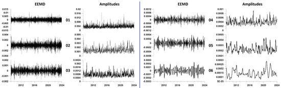 Plots of mean EEMD waveforms and mean instantaneous amplitudes averaged over all 15 station clusters for the first 6 decomposition levels. The left side of the figure, separated by a vertical blue line, shows pairs of graphs (waveforms—their amplitudes) for levels 1–3, and the right side shows graphs for levels 4–6. The decomposition level numbers are indicated between the waveform and amplitude graphs.