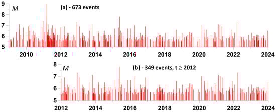 Time sequence of earthquakes with a magnitude of at least 5.5 in the vicinity of the Japanese Islands: (a) in the time period 2009–2023; (b) in the period of time 2012–2023.