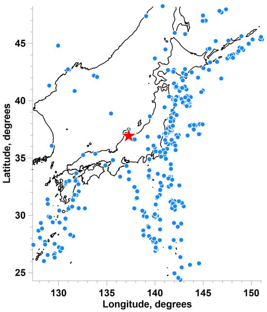 Distribution of epicenters of 349 earthquakes with a magnitude of at least 5.5 in the vicinity of the Japanese Islands in the time period 2012–2023. The red asterisk marks the center of gravity of the centers of 15 clusters of GPS stations (Figure 1a), which is chosen as the center of a circle with a radius of 1500 km.