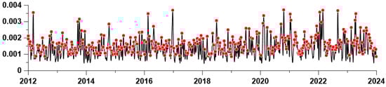 In Figure 7, the red dots represent the selected 349 largest local maxima of the average amplitude of the envelopes at the second level of decomposition.