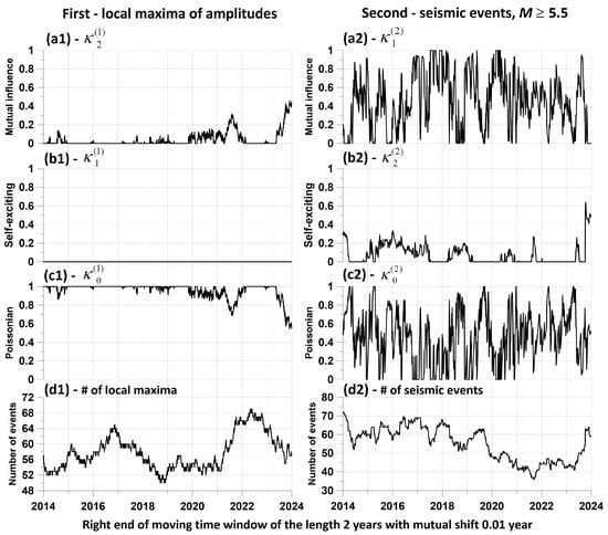 Graphs of changes in the components of the influence matrix between sequences of seismic events with a magnitude of at least 5.5 and the sequence of moments in time of 349 of the largest local maxima of the average amplitudes at the second level of EEMD decomposition. The estimates were made in a sliding time window of length 2 years with a shift of 0.01 year for a relaxation time of the model (24, 25) of 0.1 year. The graphs (a1–c1) refer to the components of the influence matrix (35), which refers to the intensity fractions of the sequence of the largest local amplitude maxima, while the graphs (a2–c2) refer to the intensity fractions of the sequence of seismic events. Plots (d1) and (d2) present the numbers of local maxima of amplitudes (d1) and the number of seismic events (d2) within moving time window. Other explanations are in the text.