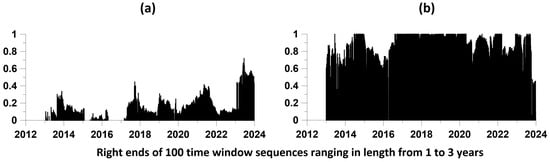 Maximum values of the elements of the influence matrices in a sequence of 100 time windows of length from 1 to 3 years, taken with an offset of 0.01 year: (a) for the “direct” influence of the time points of seismic events on the positions of the largest local maxima of average amplitudes on the second EEMD level of decomposition; (b) for the “reverse” influence of the positions of amplitude maxima on earthquakes. The relaxation time of the model is 0.1 year.