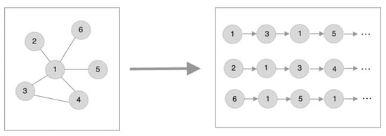 The original random walk algorithm picks network nodes by continuously walking around the network topology with the connecting edges of the nodes [36,37]. Its inputs and outputs are shown in Figure 2.