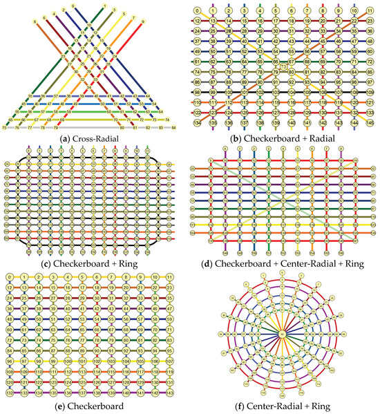 Although the urban road network structure is inextricably linked to the structural characteristics of the city itself, its form generally consists of one or more combinations of basic road network forms. Therefore, in order to take into account a variety of road network forms, the basic road network forms calculated in this section include Cross-Radial, Checkerboard + Radial, Checkerboard + Ring, Checkerboard + Center-Radial + Ring, Checkerboard and Center-Radial + Ring, as shown in Figure 3.