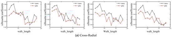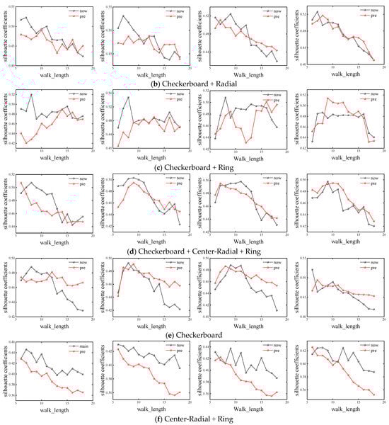 In order to ensure the accuracy of the experiment, this paper fixed the number of random walks as number_walks = 10, 15, 20 and 25, and calculated the simulation results of different basic road networks with walk_length from 6 to 18, respectively. The corresponding silhouette coefficients of different road network shapes under different parameters are shown in Figure 4.