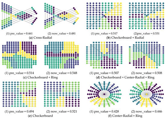 It can be seen that the F-Deepwalk model has no obvious enhancement effect in Checkerboard + Center-Radial + Ring, but has obvious enhancements in other wire network types.