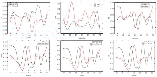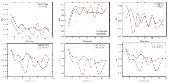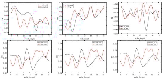 The nodes with different colors in the figure correspond to the urban spatial communities where the nodes are located in the network. It can be seen from Section 3 that the model usually obtains the maximum value when number_walks = 20. In order to simplify the experiment, we first set number_walks = 20, then adjust walk_length, then fix walk_length and readjust number_walks. In order to ensure the accuracy of the experiment, we also adjusted the dimensionality of PCA reduction. The modularity values (M), silhouette coefficients (LK), Davies–Bouldin coefficients (DB), ARI, AMI, and Harmonic mean values for different parameters are shown in Figure 7, Figure 8 and Figure 9.