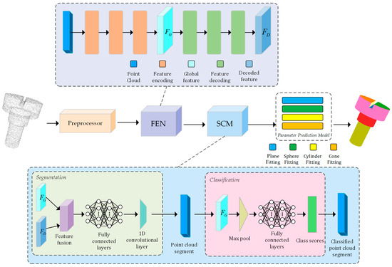 In terms of approaches based on neural networks, Tulsiani et al. [24] and Zou et al. [25] were among the first to introduce neural networks for deconstructing and decomposing shapes. They proposed a network architecture that assembles complex geometric shapes using simple 3D voxels. Subsequent researchers have extended this idea. For instance, Sun et al. [26] constructed a network architecture for predicting cuboid parameters to abstract the structure of 3D objects. Smirnov et al. [27] introduced a framework for predicting parametrized shape primitives through deep learning, which utilizes distance fields to perform transformations between pixel grids and input data, applicable to 2D and 3D tasks. Lin et al. [28] proposed a method for editing primitive adaptations to target shapes based on reinforcement learning. Subsequent research focused on fitting various types of primitives, such as solutions based on super quadric geometric primitives studied by Paschalidou et al. [29]. Gadelha et al. [30] developed a generative model that establishes compact 3D expressions by predicting parameters for cubical and spherical meshes. Additionally, networks for learning 3D representations of convex shape sets through recursive spatial subdivision have been proposed by Chen et al. [31] and Deng et al. [32]. Local shape elements expressed using implicit functions have been explored by Genova et al. [33,34]. However, the types of primitives used in these studies are fairly limited, with most work focusing on abstracting input shapes using coarse prototypes. Some research has considered fitting multiple primitive types, such as a network proposed by Gopal et al. [35] that predicts Constructive Solid Geometry (CSG) structures from complex primitive geometric shapes, though its accuracy is limited by the definition within low-resolution voxel grids. Li et al. [36] proposed a geometric primitive-fitting network based on surface and edge detection, with an emphasis on learning edge and geometric features. However, the network may fail when edges of adjacent primitives are missing. Li et al. [5] presented the SPFN framework for more precise fitting of various primitives including planes, spheres, cylinders, and cones; Sharma et al. [37] further extended this method to adapt to B-spline surface stitching; Saporta [38] undertook unsupervised recursive structural modification of this framework; while Lê et al. [7] applied a cascaded structure combining local and global features to SPFN. Although these methods are effective, most of them use the ready-made network architecture PointNet++ [6] to encode input point clouds and are thus subject to constraints of the point cloud scale (such as processing at most an 8 k magnitude of points) and hindered by the limitations of point cloud feature extraction capabilities. Our proposed method innovatively provides a new network architecture composed of a preprocessing module, feature extraction module, classification segmentation module, and parameter prediction module.