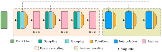 where , with being any query point, the initial value of set to 2, and set to 3; is a small constant to avoid the situation of division by zero, denotes the feature vector of the i-th point, and denotes the distance from the i-th point to the query point . Meanwhile, skip connections update the feature vector of each point through a fully connected layer and a ReLU layer, ensuring the effective transmission of features and non-linear enhancement. After combining the features, we apply the PointConv operation on the mixed features to obtain the final deconvolution output, a process similar to deconvolving layers in image processing. This procedure is repeated until the features of all the input points are propagated back to the original resolution.