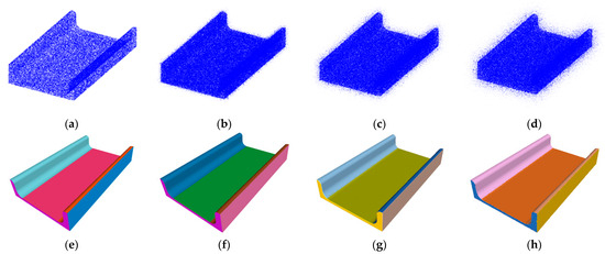 In the case of planar entities, we generated 1000 3D plane point cloud datasets that satisfy the normal vector and a distance from the origin. Table 2 shows the predicted results of the primitive parameters after adding different noise levels (no noise, 5% noise, 10% noise, 15% noise) and the absolute error compared to the theoretical ground truth.