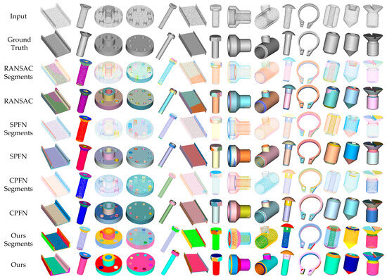 Figure 9 displays the fitting results of the neural network’s predictions for the geometric primitive parameters applied to CAD models. The input point cloud is displayed at the top of the image. The middle row shows the color-coded representation of the point cloud after our network predicts the point-to-primitive affiliations, where points of the same color represent classification to the same geometric primitive. The bottom line presents three-dimensional primitive graphic meshes assembled by a sequence of CSG [35] operations, which are based on parameters predicted by our network.