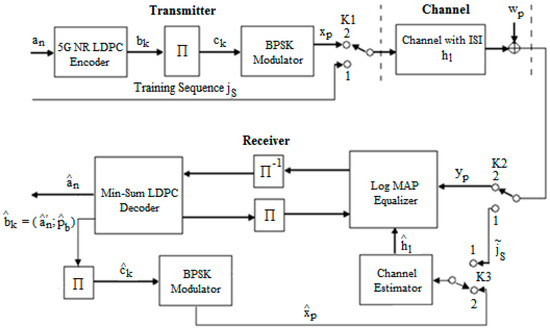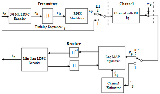 - Performing the performance analysis regarding the BER against SNR of the new schemes contrasted with the ideal situation where we assumed a perfect estimate of . The simulations carried out in Section 4 demonstrated that BER performance approaches the case where we have a perfect estimate of impulse response when it was estimated based on the training sequence and re-estimated twice using the estimated sequence produced by the min-sum LDPC decoder.