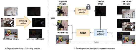 1]. In the first phase of semi-supervised training, we used 3, 5, or 8 real image pairs from the LOL dataset to train the dimming module. For the second phase (see