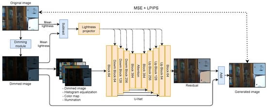 8] model to restore their original light conditions. Our UNet architecture incorporates a brightness level conditioning to represent light differences and predict the contrast between dark and light images, rather than directly predicting the light values themselves. This approach allows the model to learn conditioned image light enhancement, providing flexibility and adaptability to various lighting conditions.