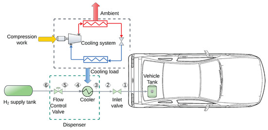A simplified version of an HRS is shown in Figure 1. The refueling process starts when hydrogen is dispensed from the high-pressure supply tanks (stream 6) with the hydrogen flow regulated by the flow control valve. Subsequently, the hydrogen exiting the control valve (stream 5) is thermally conditioned in a cooler that supplies the required cooling load through a refrigeration system. Once the hydrogen flow rate and temperature are adequate, hydrogen enters the vehicle tank through the inlet valve.