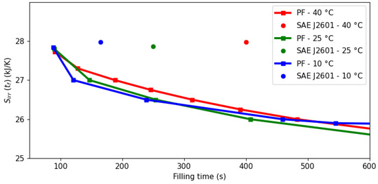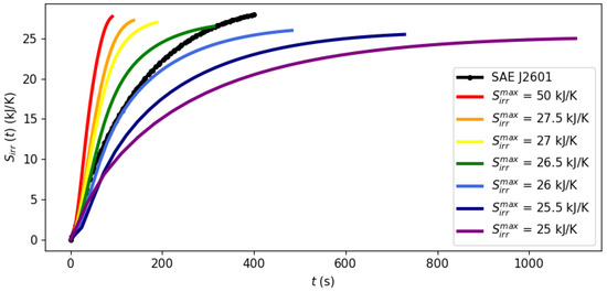 Figure 3, Figure 4 and Figure 5 illustrate the optimal filling profile at different points of the Pareto frontier. For instance, when time is minimized with a virtually unbounded entropy production (= 50 kJ/K, red curves), the flow rate quickly achieves its maximum allowed value of = 0.06 kg/s. Accordingly, the cooling load is more intense when there is a higher flow rate (= 50 kJ/K) or when there is a stricter requirement of inlet temperature (Protocol SAE J2601). As the requirement of maximal entropy production becomes more stringent, it is no longer feasible to operate at a maximum flow rate, dispersing the filling operation over time. Figure 5 shows that an excessively long filling time is necessary for the system to achieve its practical minimal point of entropy production at 25 kJ/K.