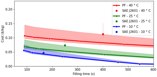 The trade-off between operating costs and filling time has been analyzed for three ambient temperatures (10, 25 and 40 °C) and typical seasonal electricity costs in Irvine (California, USA), in the Los Angeles metropolitan area. Results are shown in Figure 6, with the continuous line corresponding to usual electricity rates, while the shadowed zone represents the range between minimum and maximum values registered in 2023. The circles correspond to costs associated with filling according to the protocol SAE J2601, which once again lie outside the Pareto frontier.