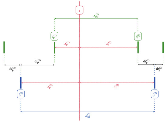 Variables used to compute the SPIKE similarity. The green and blue solid bars respectively represent the spike times of spike trains 1 and 2, relative to some observation time t, shown by the red line.
