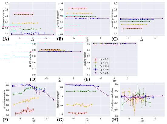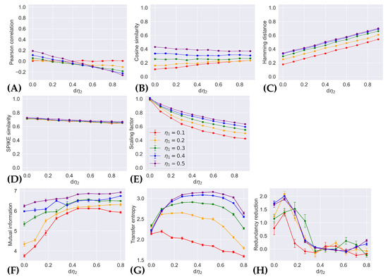 However, Figure 2 shows that, with the exception of mutual information and transfer entropy, existing indices are insensitive to . No index among the Pearson correlation (Figure 2A), cosine similarity (Figure 2B), Hamming distance (Figure 2C), SPIKE similarity (Figure 2D), and scaling factor (Figure 2E) displays changes with at all. The lack of change in the scaling factor is most unsurprising since this index is only designed to measure the norm of a vector; in this case, the norm of a pattern is equivalent to the sum of the number of times each neuron fires, which remains fixed throughout the experiment. There does not appear to be a change in transfer entropy (Figure 2G) from systems whose two neurons fire independently, to those with anti-correlated neurons (i.e., when ); only when the two neurons became strongly correlated (as became sufficiently large when ) does transfer entropy decrease. The amount of redundancy reduction (Figure 2H) appears to only vary insignificantly around 0, no matter what the value of is.