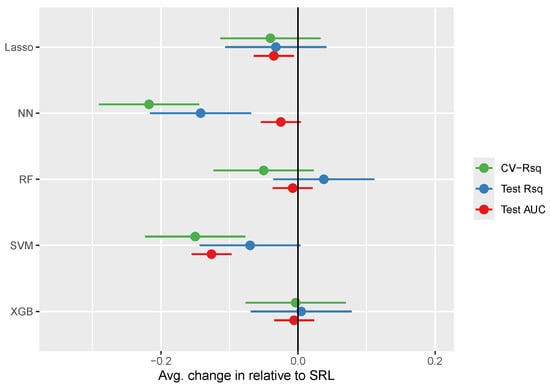 Linear mixed model results contrasting the expected change in predictive accuracy compared to SRL, controlling for data set-specific prediction difficulty. CV: cross-validation. AUC: area under the receiver operator curve.