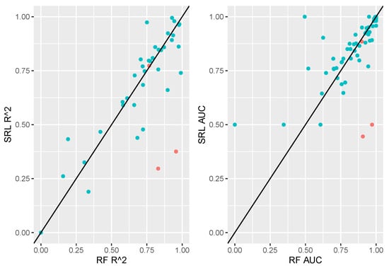 Figure 3 displays a comparison of random forests to the SRL in terms of out-of-sample performance for all data sets. Here we note that random forests and SRL performed similarly on the majority of data sets. There are a handful of cases in which random forests highly outperformed the SRL. A subset of data sets denoted in Figure 3 as red points will be investigated in the next section as illustrative case studies.