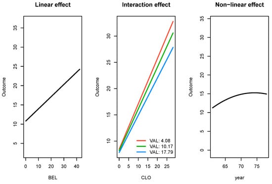 The first case study is the 503_wind data set, for which the PMLB goal is to predict daily average wind speed at a weather station in Malin Head, Ireland, based on the date and the wind speeds recorded by 11 weather stations in the Republic of Ireland in the years 1961–1978 [29]. This data set has 6574 observations, and it is further summarized in Table S2. We found that the SRL outperformed all other methods in terms of test R-squared and test RMSE, with a notably faster run time than the random forests, SVMs, and, to a lesser extent, neural network methods. Results for the 503_wind data set are provided in Table 4. In addition to the SRL being the best performer, it also produced parameter estimates that are interpretable. In Figure 4, we present the effects for three types of significant relationships found by the SRL in the 503_wind data: linear, linear with an interaction effect, and a nonlinear effect.