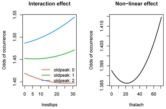 The second case study is the hungarian data set, which consists of a subset of patients undergoing catheterization at the Hungarian Institute of Cardiology in Budapest between 1983 and 1987 [30]. The PMLB prediction goal is to predict the presence of heart disease based on a set of 14 variables (summarized in Table S3). The SRL was the fourth best performing model in terms of the AUC; however, the performance of the top four models was extremely close, with each having an AUC value within 0.032 of one another. Results for the hungarian data set are provided in Table 5. While the SRL did not outperform random forests for this data set, it did provide interpretable parameter estimates relative to random forests for only a marginal reduction in performance. In Figure 5, we present the effect for two types of significant nonlinear relationships found by the SRL in the hungarian data: an interaction effect and a quadratic effect.