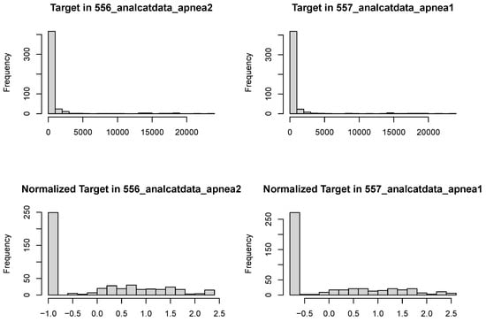 Distributions of target variables for sleep apnea data sets (top: raw; bottom: normalized).
