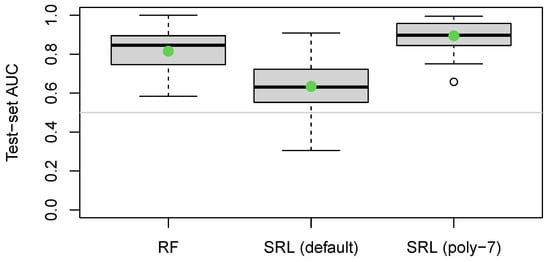 Distribution of test set area under the receiver operator curve (AUC) for random forests (RFs, left), SRL (default, middle), and SRL with up to seven-order polynomials selected (right) for 50 different train/test splits for the analcatdata_boxing1 data set.
